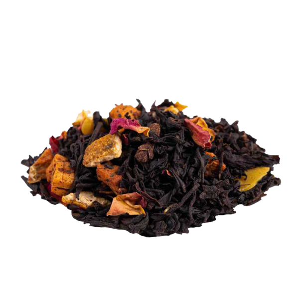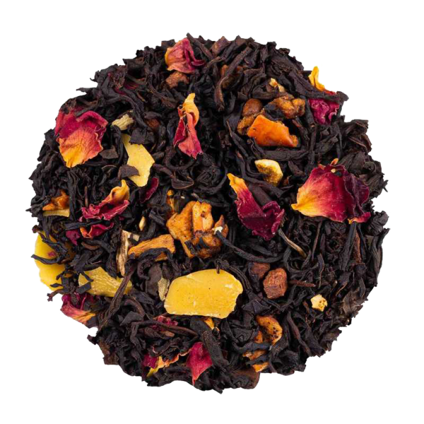 Clásica y deliciosa mezcla de té negro Ceylón aromatizado con manzana, piel de naranja, trozos de canela, almendras, pétalos de rosa, clavo y vainilla.