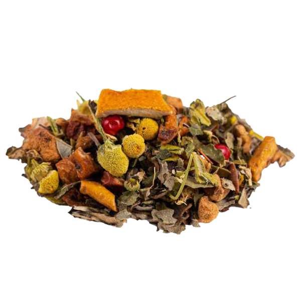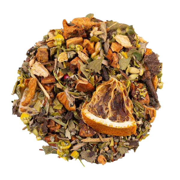 Manzana, piña, mora, hojas de olivo, rooibos super grade, jengibre, manzanilla, naranja, pimienta rosa, clavo y aloevera.
